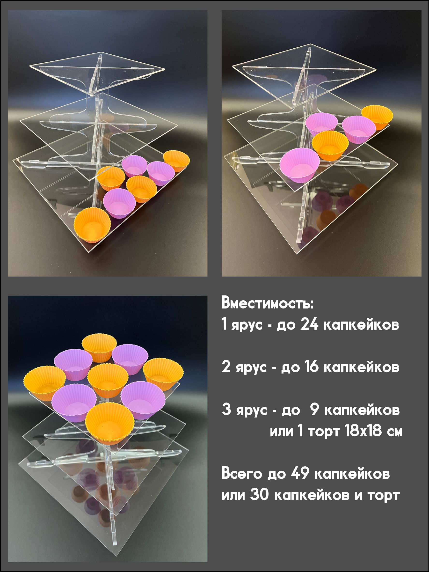 Нижний ярус (35 х 35 см) вмещает до 24 капкейков или тарталеток