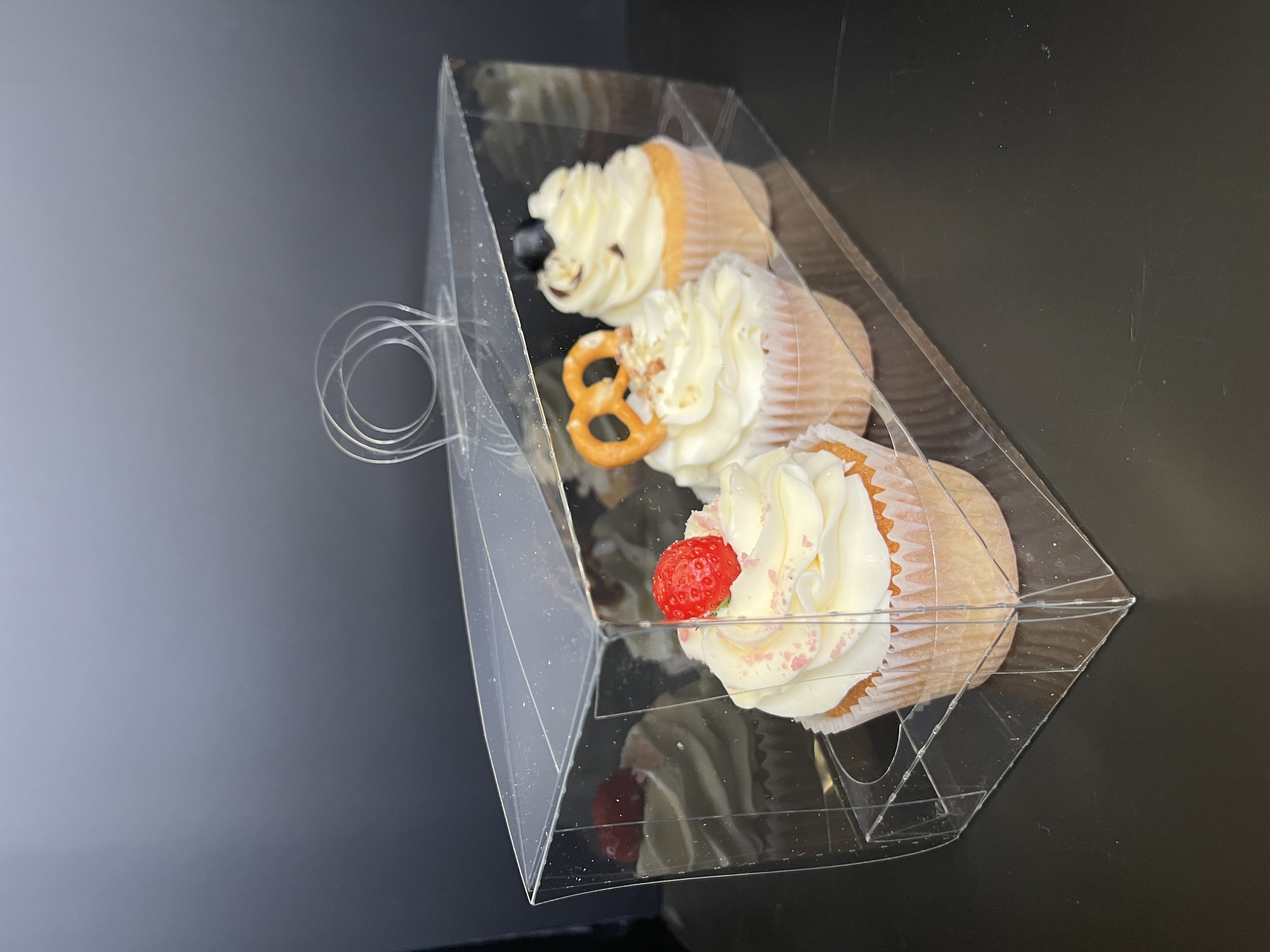 Размеры коробки: дно 24 х 8 см, высота без ручки 10 см. Ложемент для капкейков в комплекте.