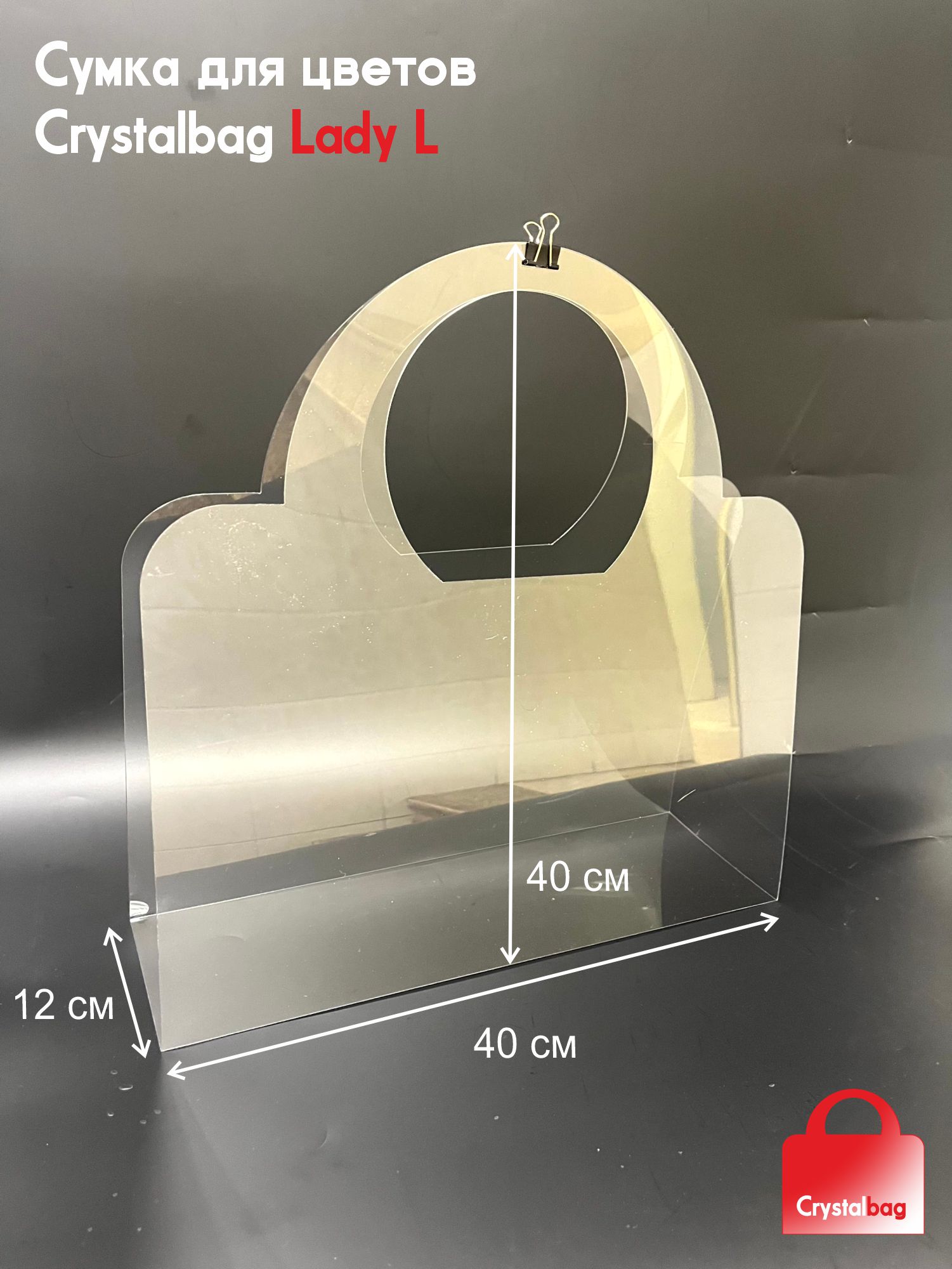 Самая большая прозрачная пластиковая сумка для цветов Crystalbag. Идеально подходит для высоких цветов. Кристально прозрачный пластик толщиной 0,5мм. отлично держит форму сумки. Поставляется в защитной плёнке. Всё, что требуется сделать флористу, это просто снять защитную плёнку и расположить цветы в сумочке. Даже небольшое букет в такой сумочке будет выглядеть стильно и богато! На фото представлена сумочка Crystalbag Lady L с букетом из 11 роз высотой 70см.